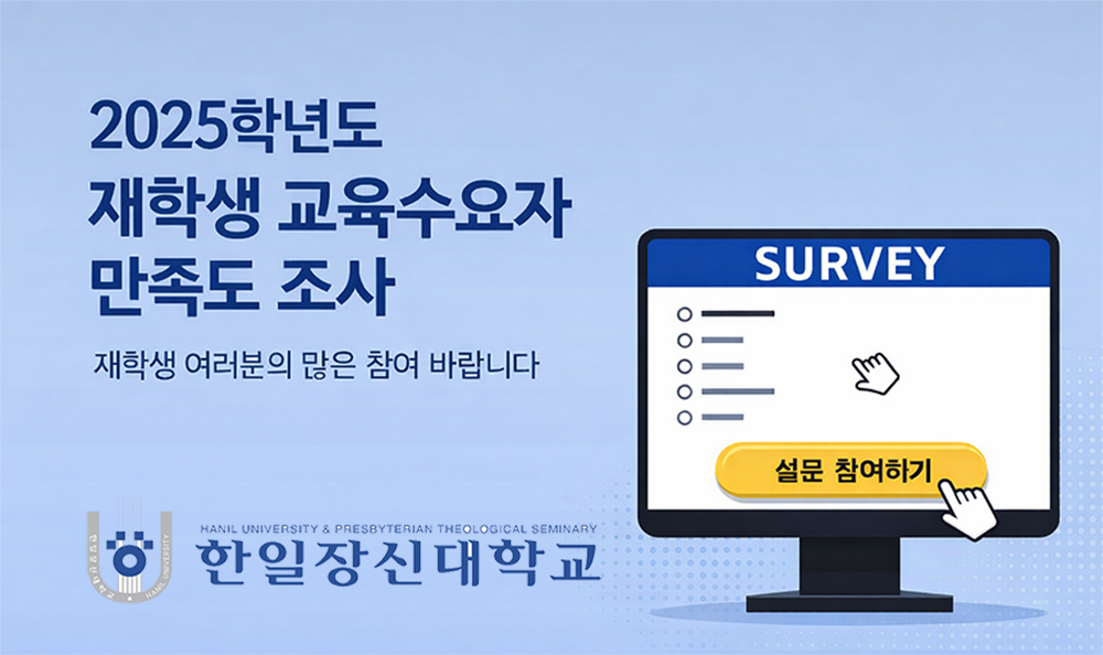 본 조사는 2025학년도 한일장신대학교 재학생들의 학교 전반에 대한 만족도를 파악하기 위한 목적으로 성과관리센터에서 진행하는 조사입니다. 학생 여러분이 응답해 주신 내용은 학교 발전을 모색하는데 중요한 기초자료로 활용될 예정이니 자유롭게 의견을 제시해 주시기 바랍니다. 본 조사 결과는 우리 대학 홈페이지 한일 E-CAMPUS – 공지사항 - 참여, 소통에서 추후 확인 가능합니다.